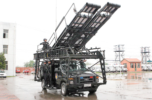 特警突擊車,又稱反恐突擊車或是快速升降車。由于這輛新型的特警裝備車能夠根據需要實施變形,特警們更喜歡稱此車為“特警汽車人”。突擊車由底盤和多功能梯組成,多功能梯采用模塊化結構設計,不但可以安裝在多種底盤平臺上,而且可以實現不同的戰術組合。靈活多變的坡面、梯子、越障板,可以實現多人、多層次、多方向的高空突破、人質救援、反劫機作戰,尤其是此車可以在快速行進中調節和伸展坡面,完全適應反恐實戰的要求。