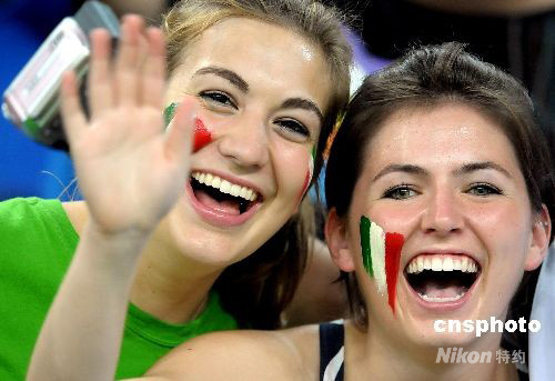 8月13日晚,北京奧運男足澳大利亞隊對陣科特迪瓦隊。圖為澳大利亞美女球迷在天津為球隊助威。 中新社發 陳文 攝