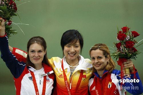 8月14日中午,在北京奧運會女子50米步槍三種姿勢決賽中,中國選手杜麗(左)以總分690.3環創造新的奧運會決賽紀錄并奪取金牌,為中國代表團在本屆奧運會上贏得第19枚金牌。 中新社發 盛佳鵬 攝