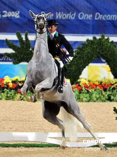 八月十四日晚,奧運馬術盛裝舞步團體賽及個人賽在香港沙田賽場舉行,并決出兩面金牌。葡萄牙選手米格爾·拉朗·杜阿爾特在比賽時坐騎“半月形的酢漿草”陣上失控起擒退出比賽。 中新社發 鄧慶樂 攝