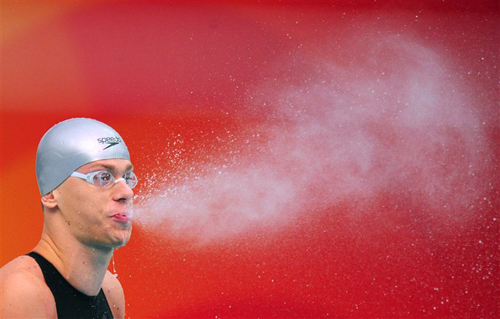 8月15日,一名巴西選手在參加完男子50米自由泳預賽后上岸,噴出一道水霧。