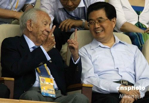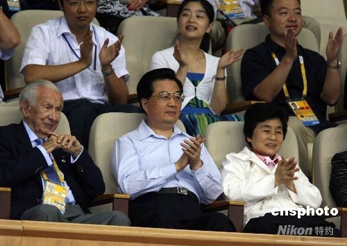 8月15日晚,胡錦濤夫婦與國際奧委會終身名譽主席薩馬蘭奇等到北京首都體育館,觀看北京奧運會中國與美國女排比賽。中新社發 任晨鳴 攝