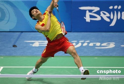 8月15日,中國選手林丹在北京奧運(yùn)會羽毛球男子單打半決賽中以2比0戰(zhàn)勝隊友陳金,進(jìn)入決賽。中新社發(fā) 武仲林 攝