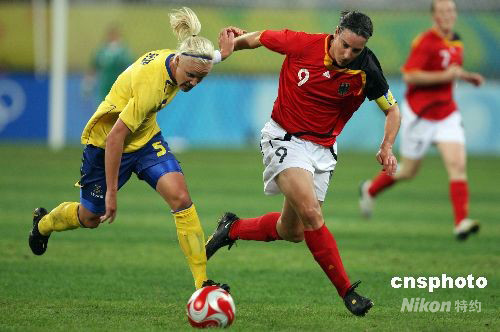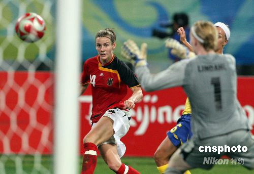8月15日,北京奧運會沈陽足球分賽場舉行女足1/4決賽,德國隊憑借加時賽,以2:0戰勝瑞典隊,進入半決賽。中新社發 張宇 攝