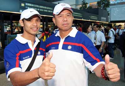 中華臺北奧運跆拳道代表隊選手宋玉麒(左)出發時候在桃園機場表示,身為本次中華臺北代表隊教練的父親宋景宏,是他參賽的最大附身符。圖為父子倆出征奧運時候在機場向送行者亮出大拇指。(上圖)