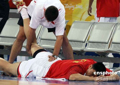 8月16日,北京奧運(yùn)會(huì)男子籃球小組賽第四輪比賽在五棵松籃球館舉行,為了爭奪小組出線權(quán)而躋身八強(qiáng)之列,由姚明率領(lǐng)的中國隊(duì)與由諾維斯基、卡曼率領(lǐng)的德國隊(duì)展開“生死大戰(zhàn)”之前兩小時(shí),中國隊(duì)就到達(dá)賽場,姚明在場地內(nèi)一邊“偷窺”德國隊(duì)的訓(xùn)練,一邊接受火箭隊(duì)隊(duì)醫(yī)的專門治療。中新社發(fā) 任晨鳴 攝