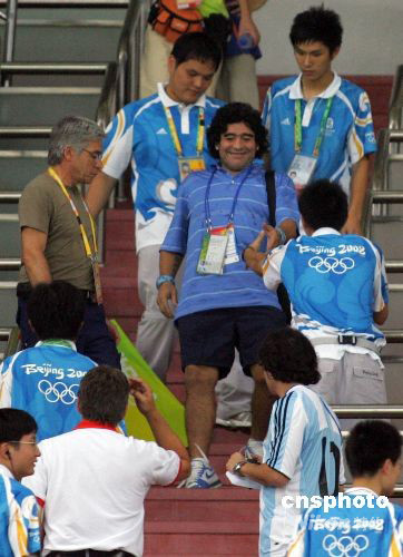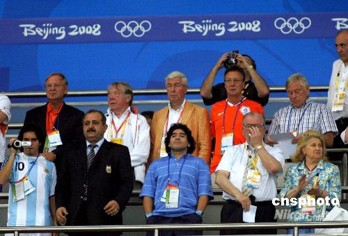 8月16日,北京奧運會男足,阿根廷VS荷蘭的比賽在上海體育場進行。球王馬拉多納親臨上海為阿根廷加油助威。中新社發 湯彥俊 攝