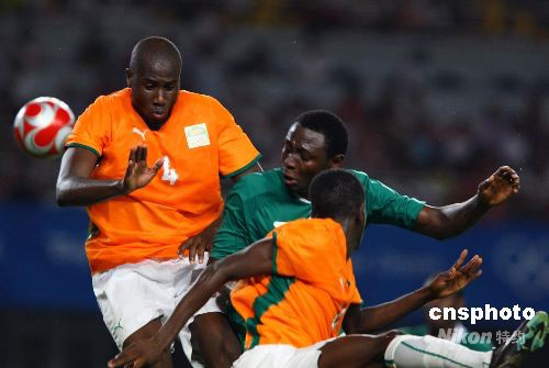科特迪瓦隊4號班巴與尼日利亞隊員爭頂頭球。