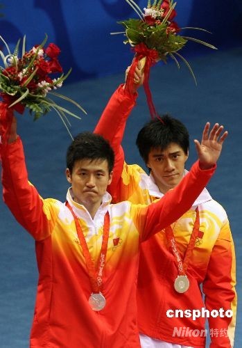 8月16日晚,中國選手蔡赟、傅海峰在北京奧運會男子雙打決賽中不敵印度尼西亞選手馬爾基斯·基多、亨德拉·塞蒂亞萬,獲得銀牌。中新社發 武仲林 攝