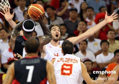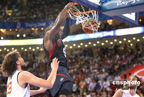 北京奧運會男子籃球小組賽第四輪比賽8月16日在五棵松籃球館舉行,同為三戰三勝的美國“夢八隊”、世錦賽冠軍西班牙隊,午夜時分展開驚心動魄的激情碰撞。最后美國隊以119比82擊敗西班牙隊。圖為韋德突破加索爾兄弟的防守扣籃。中新社發 任晨鳴 攝