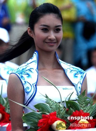 8月17日傍晚,北京2008奧運帆船比賽在青島分賽場舉行,身著“青花瓷”頒獎服窈窕的禮儀小姐格外搶眼。中新社發 趙振清 攝