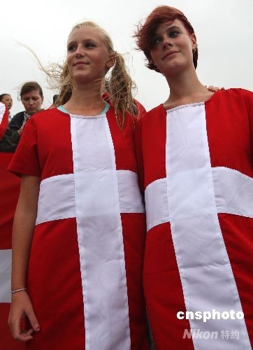 身著國旗圖案服裝的丹麥美女拉拉隊(duì)現(xiàn)場格外引人注目。中新社發(fā) 趙振清 攝