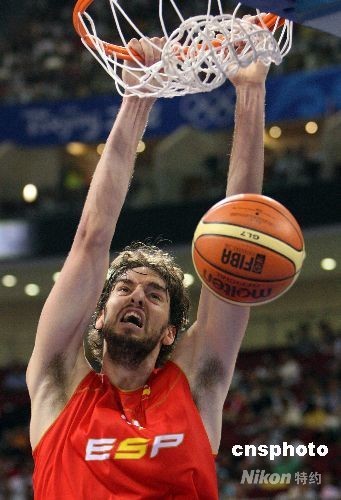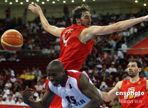北京奧運(yùn)會男籃小組賽最后一輪賽事8月18日在北京五棵松籃球館舉行,此前三勝一負(fù)的世錦賽冠軍西班牙隊以98比50擊敗非洲冠軍安哥拉;安哥拉隊五戰(zhàn)五負(fù),小組墊底。西班牙的超級巨星保羅·加索爾僅僅上場23分鐘,不僅砍下全場最高的31分,而且嚴(yán)密的防守讓對手往往無功而返,充分體現(xiàn)了“領(lǐng)袖氣質(zhì)”。中新社發(fā) 任晨鳴 攝