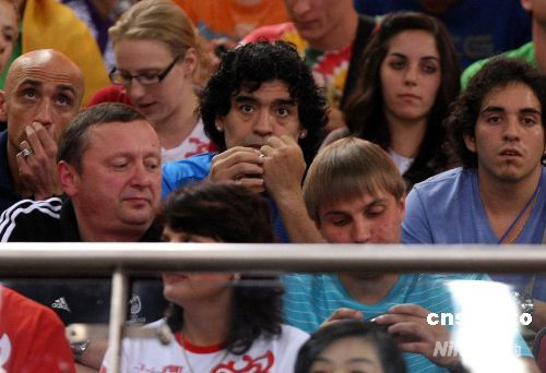8月18日晚,“球王”馬拉多納駕臨北京五棵松籃球館,觀看北京奧運會男籃阿根廷隊與俄羅斯隊之戰。中新社發 任晨鳴 攝