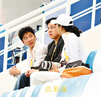 媒體曾在水立方發現朱玲玲(右)、霍啟剛(中)和霍啟仁觀看晶晶比賽。