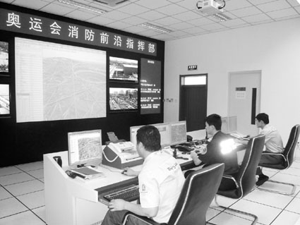 ▲消防官兵正在奧運(yùn)消防前沿指揮部緊張工作