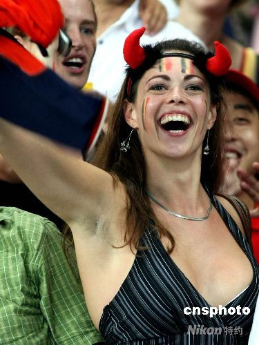 8月19日,北京奧運會男足半決賽,尼日利亞與比利時的比賽在上海體育場進行。一位比利時女球迷在觀眾席上激情助威,吸引現場觀眾的目光。 中新社發 湯彥俊 攝