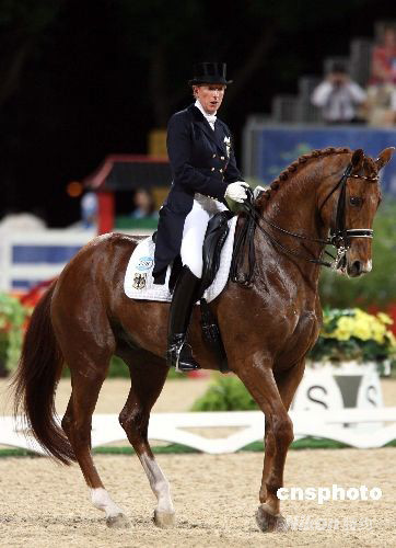 八月十九日晚,在香港沙田奧運(yùn)馬術(shù)盛裝舞步個(gè)人賽(大獎(jiǎng)賽自選動(dòng)作)上,德國(guó)選手海克·克默爾獲銅牌。 中新社發(fā) 洪少葵 攝