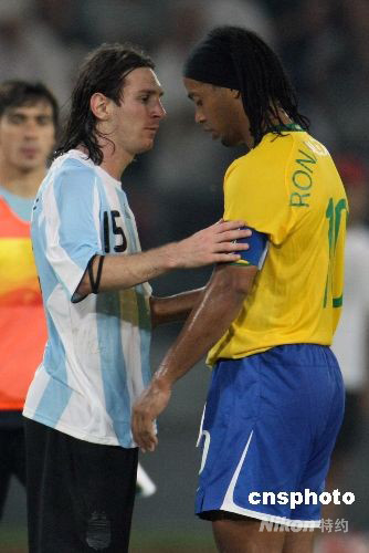 8月19日晚,北京奧運會男足第二場半決賽在北京工人體育場舉行,由球星梅西領銜的阿根廷隊以3比0淘汰巴西隊進入決賽。賽后,梅西與巴西隊隊長羅納爾迪尼奧擁抱并安慰這位好友。 中新社發 任晨鳴 攝