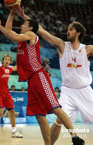 8月20日,北京奧運會男子籃球八進四淘汰賽在五棵松籃球館開戰,2006年世錦賽冠軍西班牙隊在球星保羅·加索爾的率領下,以72比59戰勝歐洲勁旅克羅地亞隊。保羅·加索爾(白)上場26分鐘,砍下全場最高的20分。中新社發 任晨鳴 攝