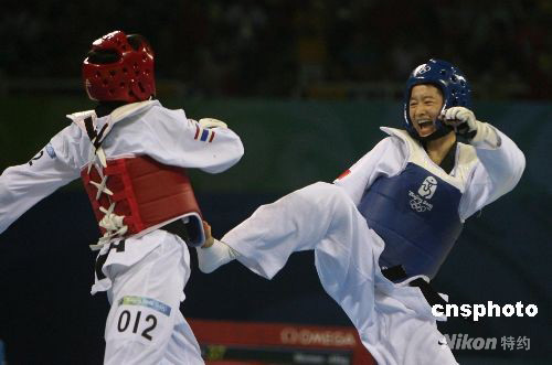 8月20日,中國選手吳靜鈺在北京奧運會跆拳道女子49公斤以下級決賽中戰勝泰國選手布特雷·貝德蓬,奪得冠軍。中新社記者 武仲林 攝