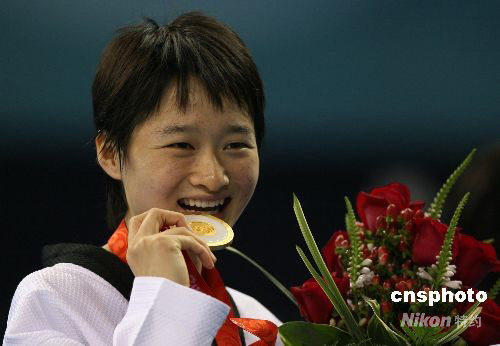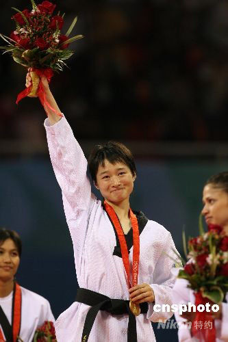 8月20日晚,北京奧運會跆拳道女子49公斤級以下決賽在北京科技大學體育館舉行,中國選手吳靜鈺以1:-1戰(zhàn)勝泰國選手布特蕾·貝德蓬獲得冠軍,成為中國跆拳道在本屆奧運會上奪得的第一枚金牌,也是中國代表團在本屆奧運會上獲得的第45枚金牌。 中新社發(fā) 武仲林 攝