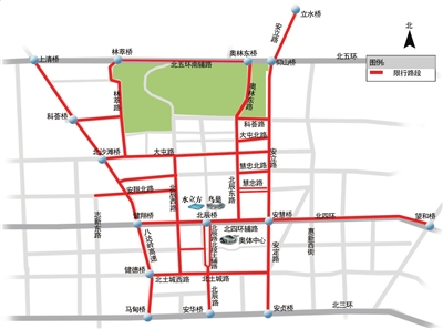 限行路段:域清街東口(含)向西,經域清街至水源九廠東側路南口(含)雙向;水源九廠東側路南口(含)向北,經水源九廠東側路至水源九廠東側路北口(含)雙向;水源九廠東側路北口(含)向東,經奧林匹克公園北部賽區公交場站北側路至林萃橋下(含)雙向。