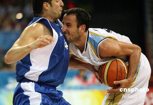 北京奧運會男籃最后一場八進四比賽,8月20日午夜時分在五棵松籃球館舉行,南美洲冠軍、雅典奧運會冠軍阿根廷隊以80比78驚險戰(zhàn)勝歐洲勁旅希臘隊,進入前四名。阿根廷隊將與美國“夢八隊”爭奪決賽權(quán)。隊中“老大”、在NBA馬刺隊效力的球星吉諾比利不僅砍下全場最高的24分,而且在最后時刻投中關鍵一球;另一名球星10號德爾菲諾(DELFINO Carios Francisco)砍下23分。中新社發(fā) 任晨鳴 攝