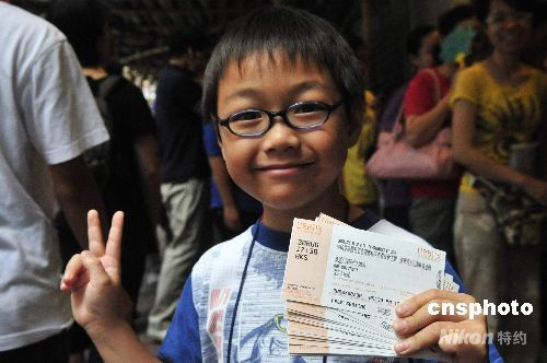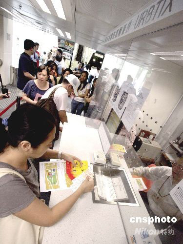 八月二十一日,中國奧運(yùn)金牌精英訪港表演門票開始發(fā)售,香港市民通宵在售票點排隊購票。入場票在今早十時開始發(fā)售,圖為市民踴躍購買。