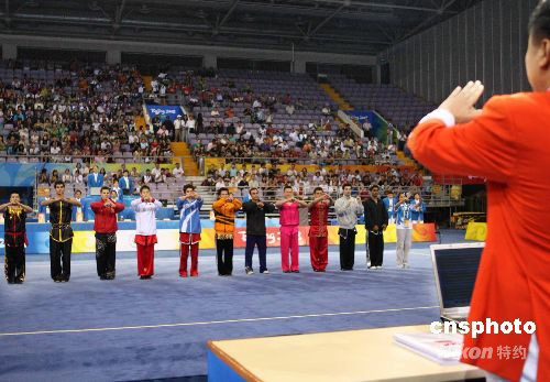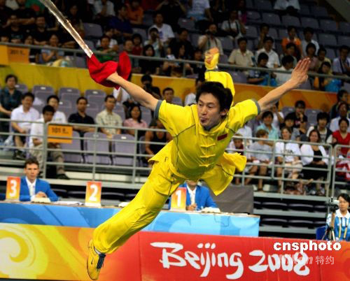 8月21日,“北京2008武術比賽”在北京奧林匹克體育中心體育館拉開帷幕。“北京2008武術比賽”經國際奧委會批準,由北京奧組委、國際武術聯合會主辦,中國武術協會承辦,于8月21日至24日在北京舉行。比賽設套路10枚金牌、散手5枚金牌。有來自世界五大洲43個國家和地區的128名男女運動員參加比賽。為了使更多國家和地區的運動員在本次比賽中獲得獎牌,國際武術聯合會做出了在15個比賽項目中,每個國家和地區最多只能參加8項的規定。中新社發 宋吉河 攝