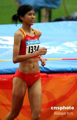 北京奧運會田徑比賽8月21日在“鳥巢”冒雨舉行,中國女子跳高選手鄭幸娟在大雨中三跳未能通過1.93米的資格賽高度,無緣決賽圈。 中新社發 任晨鳴 攝