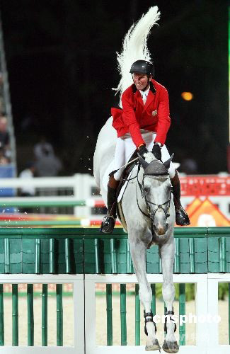 八月二十一日晚,在香港舉行的奧運馬術項目比賽進行最后一天賽事,比利時選手若斯·蘭辛克策坐騎“屈馬諾”在場地障礙賽個人決賽上表現出色,在A輪賽上獲得零罰分。中新社發 洪少葵 攝