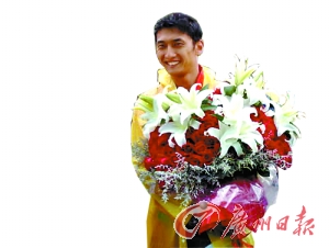昨天,女子沙灘排球頒獎(jiǎng)儀式在大雨中隆重舉行,之后三對(duì)獲獎(jiǎng)選手陸續(xù)走過混合區(qū)。此刻,混合區(qū)外邊一個(gè)獨(dú)特的“景致”吸引了大家的注意:一個(gè)高大帥氣的小伙子手捧一束玫瑰,安靜地等待著。他正是田佳在八一沙排隊(duì)的隊(duì)友兼男友鄭鴻勇(見右圖),“本來不讓他來看比賽,不過到了16進(jìn)8的淘汰賽后他非得要來,那我就找來票給他,每次他都坐在我可以找到的地方。”這也揭開了大家的一個(gè)疑問,從淘汰賽開始,田佳每贏得一場(chǎng)勝利都會(huì)沖著觀眾席的某一個(gè)方向送出飛吻,原來,她是有“目標(biāo)”的。