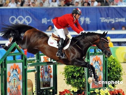 八月二十一日晚,奧運馬術在香港沙田賽場舉行場地障礙個人賽決賽。加拿大選手埃里克·拉馬茲策騎馬匹“希克斯特德”贏得金牌。中新社發 鄧慶樂 攝