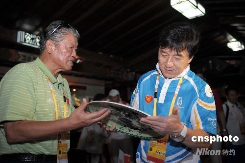 8月22日下午,曾任中共中央政治局委員、國務委員、全國人大常委會副委員長的李鐵映,與巨星成龍在北京奧林匹克公園祥云小屋共同欣賞名貴瓷器。中新社發 陳文 攝