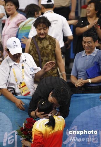 8月22日晚,在北京大學體育館進行的北京奧運會乒乓球女子單打決賽,中國乒乓球老將王楠抱憾負于隊友張怡寧獲得銀牌,在現場觀戰的王楠老公郭斌賽后撫慰愛妻。 中新社發 盛佳鵬 攝
