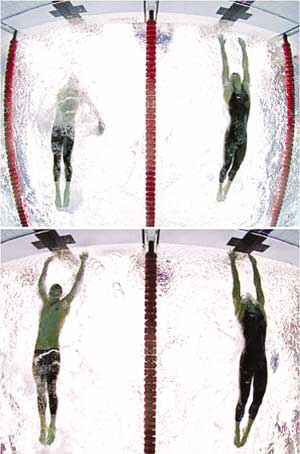 菲爾普斯和塞爾維亞的查維奇觸壁的那一瞬間。本報資料圖片