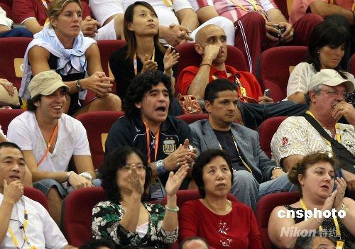 北京奧運(yùn)會(huì)男子籃球半決賽第二場(chǎng)比賽8月22日晚在五棵松籃球館開戰(zhàn),志在奪冠的美國“夢(mèng)八隊(duì)”遭遇雅典奧運(yùn)會(huì)冠軍阿根廷隊(duì),最后美國隊(duì)以101比81擊敗阿根廷隊(duì),進(jìn)入決賽。“球王”馬拉多納到場(chǎng)為本國球隊(duì)助威加油。中新社發(fā) 任晨鳴 攝