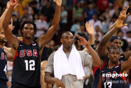 8月22日晚,北京奧運會男子籃球半決賽第二場比賽在五棵松籃球館開戰(zhàn),美國“夢八隊”最后以101比81戰(zhàn)勝上屆奧運會冠軍阿根廷隊,進入決賽。賽后,科比率領(lǐng)美國眾球星向觀眾敬禮致謝。中新社發(fā) 任晨鳴 攝