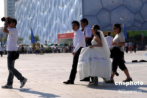 北京奧運接近尾聲,一對新人在水立方外拍攝婚紗照片。中新社發(fā) 廖攀 攝