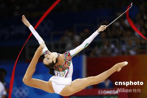 8月23日晚,在北京工業大學體育館舉行的北京奧運會藝術體操個人全能決賽中,烏克蘭選手加娜·別茲索諾娃獲得銅牌。圖為加娜·別茲索諾娃在比賽中。 中新社發 盛佳鵬 攝