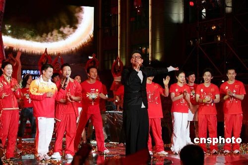 8月23日,在北京奧運會即將閉幕之際,香港演藝巨星張學友攜手中國奧運冠軍王楠、張湘祥、楊威、陳一冰、程菲、鄒凱、肖欽,一同亮相北京奧運文化廣場,與民眾分享這場體壇盛宴,為中國加油,為奧運加油。中新社發 富田 攝