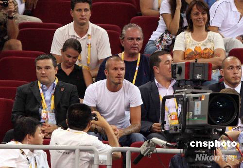 8月24日下午,北京奧運(yùn)會(huì)男籃決賽在五棵松籃球館舉行,美國(guó)“夢(mèng)八隊(duì)”以118比107艱難戰(zhàn)勝西班牙隊(duì),獲得本屆奧運(yùn)會(huì)金牌。圖為前來(lái)為北京奧運(yùn)會(huì)閉幕式做表演的足球明星貝克漢姆到場(chǎng)觀戰(zhàn)。 中新社發(fā) 任晨鳴 攝
