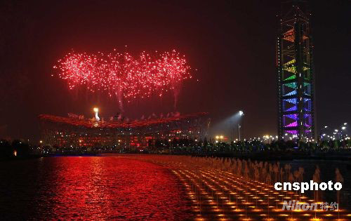 8月24日晚,北京奧運(yùn)會閉幕式在奧林匹克公園內(nèi)的國家體育場“鳥巢”舉行,絢麗的煙花映照“鳥巢”上空。