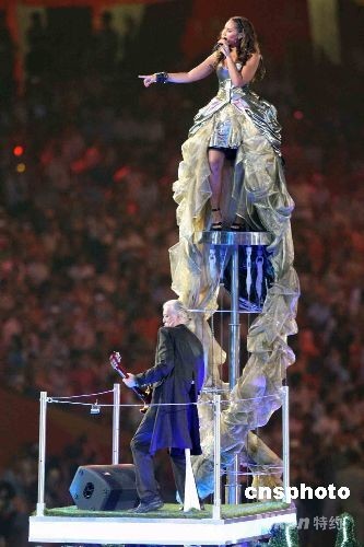 8月24日晚,北京奧運(yùn)會(huì)閉幕式在奧林匹克公園內(nèi)的國家體育場(chǎng)舉行,下屆奧運(yùn)會(huì)主辦地倫敦市在“鳥巢”上演倫敦8分鐘節(jié)目,在英國大型選秀節(jié)目“XFactor”中脫穎而出的偶像歌手利昂娜·劉易斯與英國著名搖滾樂隊(duì)“齊柏林飛船”的主音吉他手吉米·佩齊聯(lián)袂獻(xiàn)歌;還有英國民歌、都市街舞、Hip-Hop霹靂舞等表演。中新社發(fā) 任晨鳴 攝
