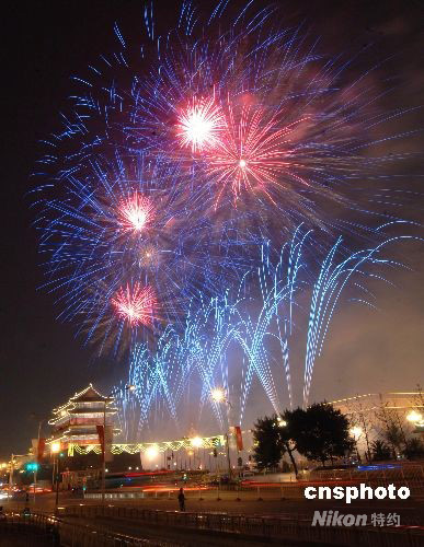 8月24日晚,第29屆夏季奧運(yùn)會(huì)在北京國(guó)家體育場(chǎng)“鳥(niǎo)巢”勝利閉幕。北京天安門(mén)廣場(chǎng)燃放了20分鐘焰火,將正陽(yáng)門(mén)上空照耀得絢麗多彩。中新社發(fā) 鄒憲 攝