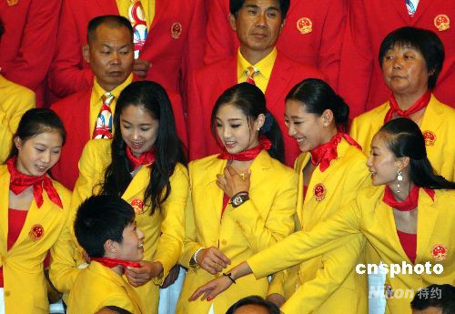 8月26日,2008年北京奧運會中國體育代表團總結大會在北京人民大會堂金色大廳舉行。中國藝術體操隊員參加北京奧運會中國體育代表團總結大會。 中新社發 廖文靜 攝