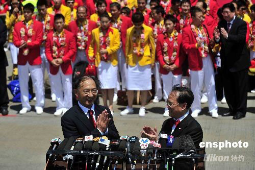 八月二十九日上午十一時,國家奧運金牌運動員代表團乘坐飛機抵達香港,特區行政長官曾蔭權等官員到場迎接。率團來港的國家體育總局局長劉鵬(左)表示,今次來港目的是為真誠感謝對祖國體育事業大力支持的香港同胞。中新社發 譚達明 攝