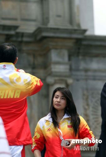 九月一日上午,在澳門訪問的北京奧運內地金牌運動員代表團一行來到著名景點大三巴游覽,興高采烈地合影。
