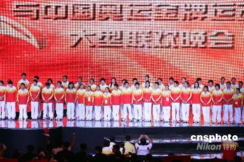 九月一日晚,北京奧運會金牌運動員代表團出席在澳門東亞運動會體育館舉行的大型聯歡晚會,與澳門市民分享他們在奧運會上拼搏奪金的精神。中新社發 洪少葵 攝
